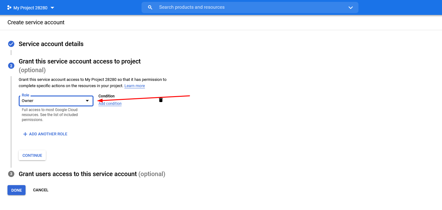 В разделе Grant this service account access to project назначаем роль этого аккаунта — Owner
