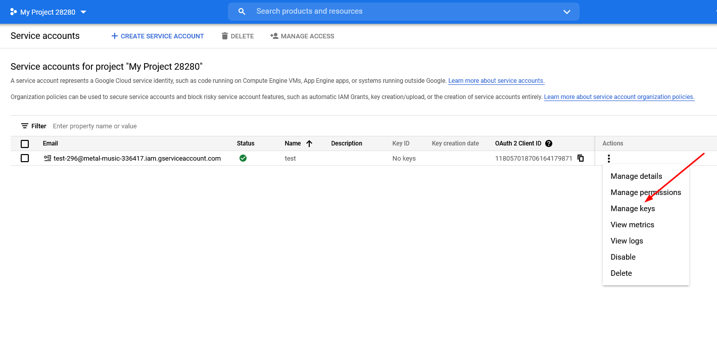 Переходим в Manage keys и нажимаем ADD KEY и Create new key