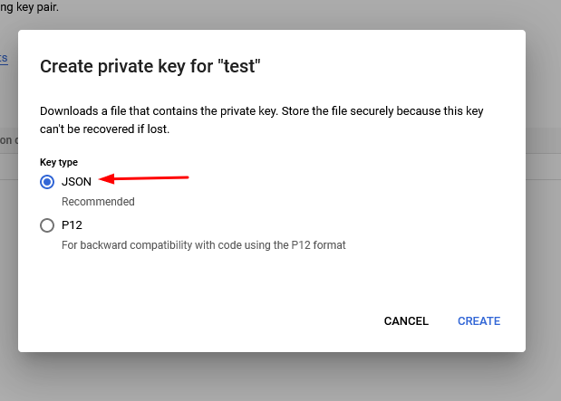 Тип ключа выбираем Json нажимаем Create и скачиваем ключ к себе на компьютер